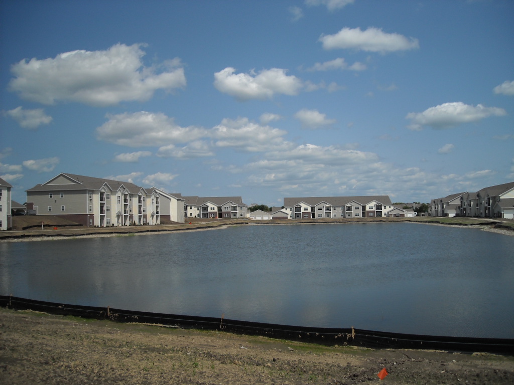 湖を囲むようにアパートが建っている。